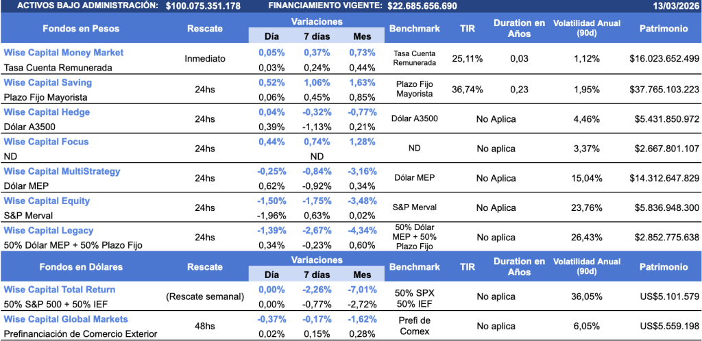 A nivel local, el riesgo país se ubica en 584 pb, en un contexto donde el dólar continúa estable y con una creciente preocupación acerca de la trayectoria inflacionaria. En ese orden la curva Cer, continúa siendo demandada en especial el tramo más corto donde el Boncer de fin de marzo comprimió desde una TEM de 2,31% hasta los 2,26% actuales. La caución a 3D operó en la última rueda en TNA 20,5% promedio. Los Fondos Wise Capital continúan con una performance sólida sostenida, especialmente para los de Tesorería, donde el Wise Capital Money Market y el Wise Capital Saving muestran subas en los últimos 7 días de 0,37% y 1,06%, respectivamente.