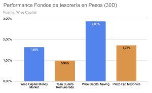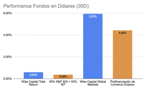 Con una caución corta, cerrando en torno a 14,6% y un promedio de mercado de 19%, la tasa continúa comprimiendo. En tanto, la tasa por adelantos en cuentas corrientes ahora se ubica en torno al 25,33% reduciéndose un 6% en lo que va del mes. En línea con esto, la demanda por bonos a tasa fija ha disminuido para el tramo medio y largo concentrándose en los plazos más cortos. Los dollar linked, por su parte, se han incrementado ante la posibilidad de ubicar más porción de cobertura cambiaria en las carteras de los inversores. En la curva de globales y Bonares, la tendencia va de la mano con el alza en el riesgo país que ahora se ubica en 549 puntos. Los Fondos Wise Capital en dólares muestran una performance destacada a 30 días vs benchmarks, al igual que los fondos de Tesorería. Nuestra opción para el fin de semana: el Wise Capital Money Market.