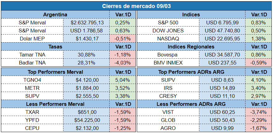 En Nueva York, los ADR argentinos también se acoplaron a la mejora global con incrementos de hasta el 4,1%, liderados por los sectores financiero, agropecuario y de real estate, mientras que los bonos soberanos (pese a cerrar con mayoría de bajas por la cautela internacional) lograron contener el daño, permitiendo que el indicador de JP Morgan retrocediera hasta las 583 unidades y se alejara de la zona crítica que había vuelto a inquietar a los inversores en las últimas sesiones.