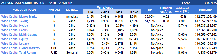 La tendencia alcista del mercado local continuó ayer y el S&P Merval avanzó 3,4%, en lo que fue la primera rueda de noviembre. Medido en dólares, el principal índice bursátil argentino también mostró un desempeño positivo, con un alza del 2,4%. En tanto, los ADRs argentinos que cotizan en Wall Street acompañaron la tendencia, con subas de hasta 7,1%, en una jornada en la que las operaciones comenzaron una hora más tarde por el cambio de horario en Estados Unidos (11:30 hora argentina). El segmento de bonos soberanos tuvo un comportamiento más moderado: los Globales en dólares (bajo legislación extranjera) retrocedieron hasta 0,7%, mientras que los Bonares (emitidos bajo jurisdicción local) registraron bajas de hasta 1,1%. Pese a las leves caídas en la renta fija, el optimismo en la renta variable se mantiene, impulsado por las expectativas de estabilidad política y continuidad de las reformas económicas tras el resultado electoral.