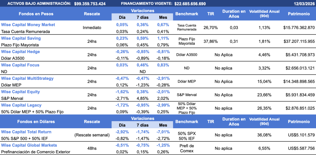 En la licitación de ayer, el Tesoro logró un rollover de 108,09%, con una demanda concentrada en el tramo corto de la curva cer ofrecido (X15Y6), y en la Lecap de mayo (S15Y6), cerrando en una Tirea promedio de 35,5% Lecap/Boncap, y dejando sobre la mesa que es más importante la contención en el mercado de cambios. En ese orden, los inversores buscan valor paralelo a la extensión de vencimientos del Tesoro. Los FCI, en general, muestran una inversión fuerte en plazo fijo en dólares, caución y soberanos rotando desde las disponibilidades, sobre todo en fondos Money Market que se consolidan como los de mayor nivel de activos bajo administración. En Wise Capital, nuestros Fondos de Tesorería en pesos, vienen sosteniendo una performance superior frente a los benchmarks de mercado, y en dólares se sostienen frente a la volatilidad global.