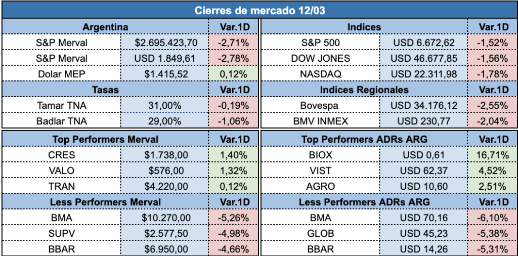 El pesimismo externo y el impacto del 2,9% de inflación local impactaron en los activos financieros argentinos y sufrieron fuertes retrocesos. La escalada bélica en Medio Oriente y el nuevo salto en el precio del petróleo no sólo golpearon a Wall Street (con caídas de hasta 1,8% en el Nasdaq) sino que también presionaron al alza los rendimientos de los bonos del Tesoro de EE.UU., con la tasa a 10 años alcanzando el 4,27% ante el temor de un nuevo shock inflacionario global.