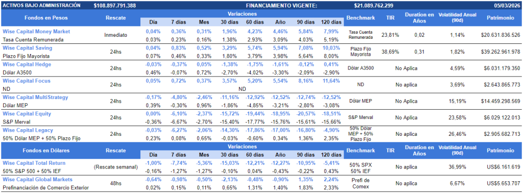 El dólar mayorista continúa estable pese al conflicto global, y cerró en $1.407, y el futuro a marzo en $1.433,5. A nivel internacional, el índice dólar se incrementó hasta los 99,3 en una tendencia creciente desde que se inició el conflicto en Medio Oriente, y en esa línea el crudo continúa su senda alcista ubicándose en USD88 por barril. Los Globales operaron mixtos y el riesgo país repuntó levemente hasta los 546 puntos, en un punto donde los Treasuries a nivel global, en general, sufren alzas de rendimientos. En el mercado de pesos, la caución a un día operó en promedio en 20,3%, con un Central más activo en la curva dollar linked en línea con la tendencia de cobertura global, donde paralelamente el Gobierno pide a los ahorristas sacar los dólares del colchón. Los Fondos Wise Capital de Tesorería, muestran rendimientos superiores a casi todos sus benchmarks y al dólar A3500 en los últimos 120 días: