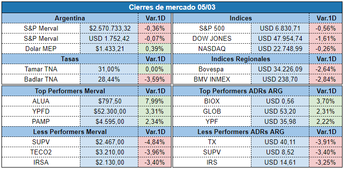 Bajo la presión de un clima global adverso por la escalada bélica entre Estados Unidos, Israel e Irán, los activos locales cerraron la jornada de este jueves con tendencia negativa, impulsando al riesgo país un 2,3% hasta los 546 puntos básicos. (Click acá para continuar leyendo)
