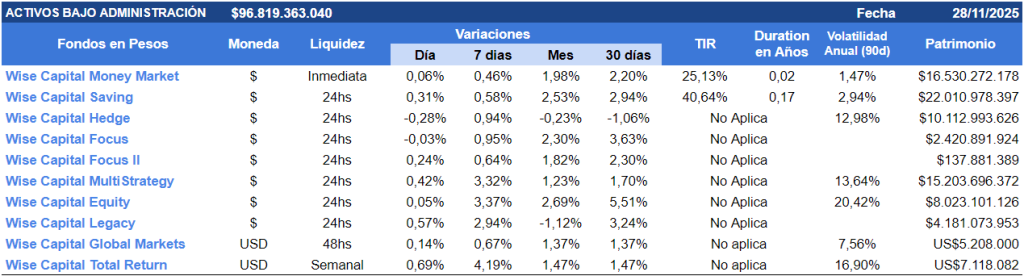 En la última rueda, nuestros Fondos mantuvieron un sólido desempeño. El Wise Capital Global Markets registra un excelente posicionamiento entre los fondos de renta fija global en dólares, ubicándose #2 en el ranking tanto por rendimiento a 7 días con 0,67%, como por rendimiento en el mes (MTD) con 1,37%. Adicionalmente, el Fondo de renta variable Wise Capital Equity se ubicó en la posición #3 MTD, alcanzando un rendimiento del 2,69%.