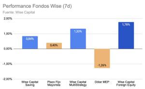 Con las tasas de Lecaps en tramo medio de agosto a noviembre, en el orden de 28,6% promedio, y una tasa de caución promedio de 19,7% en compresión, se espera que el Tesoro aproveche no solo para estirar sus vencimientos sino para cerrar una tasa más atractiva y prepararse para la licitación de fin de mes en la que enfrenta vencimientos del orden de los $10 Billones. El dato de inflación al alza potenciado por cuotas educativas, regulados y el combustible la cobertura inflacionaria vuelve a tomar vuelo con títulos CER en tramo medio y largo captando la atención de los inversores. Con esto en mente, el Wise Capital Saving y el Wise Capital MultiStrategy, con amplia inversión en títulos CER, ofrecen rendimientos de 0,84% y 1,33% en los últimos 7 días, resaltando la fortaleza de la estrategia. También, nuestro nuevo Fondo Wise Capital Foreign Equity se perfila con su composición de Cedears capturando rendimientos en los últimos 7 días de 1,78%.