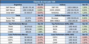 Con una inflación para marzo que supera el 3%, el Gobierno se prepara para reajustar presupuestos e incrementar la motosierra. Y es que con la caída de la recaudación es una medida inevitable. Adicionalmente, y con vencimientos por $8,3 Billones, el Tesoro ofrece un menú amplio para la próxima licitación, esperando alcanzar un rollover alto. En ese orden, ofrece una Lecap corta a agosto, títulos Cer a sep-28 y mar-29, Tamar a feb-27 y ago-27, dollar linked a jun-28, junto a los Bonos AO27 y AO28 a licitarse en dos tramos. Con esto el Gobierno apuesta a ampliar duration y aprovechar el momentum de baja de tasas. Los Fondos Wise Capital en dólares son la apuesta para los inversores que prefieren dolarizar carteras, y se perfilan para ofrecer rendimientos positivos en moneda dura de cara a lo que queda del año, en los últimos 7 días presentan un desempeño superior a sus benchmarks.