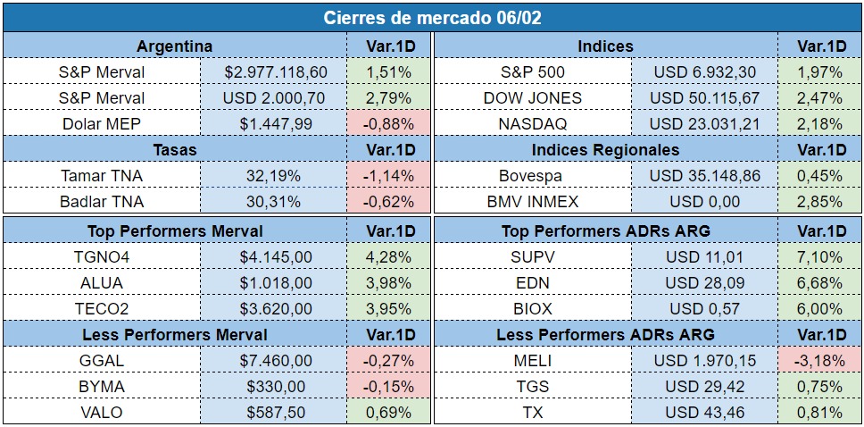 Los bonos soberanos argentinos en dólares rebotaron en Wall Street este viernes, impulsados principalmente por optimismo tras el acuerdo comercial entre Argentina y Estados Unidos, soberanos como el Bonar 2030 y 2038 subieron alrededor de un 0,8% y el Global 2030 avanzando cerca de 0,9%, aunque no todos los títulos se beneficiaron (el Global 2041 cayó cerca de 1%), mientras que en la plaza local el S&P Merval trepó cerca de 1,5% en pesos y 2,79% en dólares. (Click acá para continuar leyendo).