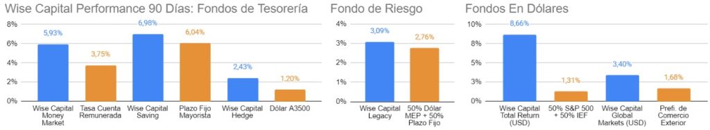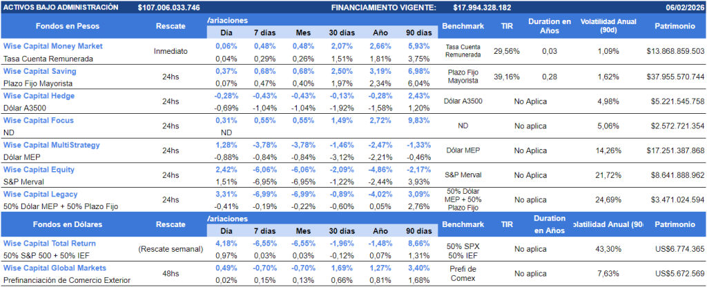 De la mano del cierre del acuerdo comercial recíproco con EE.UU, los activos de Argentina volvieron a repuntar en Wall Street y en el mercado local, en un contexto donde la volatilidad internacional también disminuyó luego de caídas sostenidas en varias ruedas debido a la cautela de los inversores acerca de los gastos de capex en IA, ahora que ha pasado la marea, llega una calma renovada donde los inversores continuaron apostando a los mercados y en esa línea el S&P 500 subió un 1,97%, el DJ +2,47% y el Nasdaq cerró en 2,18%. A nivel local el Merval en pesos subió un 1,51% y en dólares un 2,79%. En el mercado de bonos la curva a tasa fija comprimió en todos los tramos, y la caución corta se negoció en promedio en 24,6% y cerró en 18,5%, la Tamar en TNA 32,19% y la tasa de adelanto en cuenta corriente en 34,12% desde un nivel de 36,8% a inicio del mes. En esa línea, los Fondos Wise Capital registraron variaciones en los últimos 90 días superiores a sus benchmarks, siendo alternativas recomendadas para posicionarse esta semana: