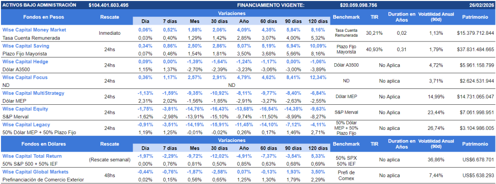 En materia de sub soberanos, Entre Ríos emitió USD300 millones de un bono Ley nueva york con vencimiento 2033 a una tasa de 9,8% y lo recaudado servirá para la recompra del bono 2028 y así poder ampliar vencimientos provinciales. De cara al fin de semana, el posicionamiento en el Fondo Wise Capital Money Market es lo que recomendamos para hacer rendir los pesos en estos días. Para el resto de la Tesorería el Wise Capital Saving ofrece rendimientos de 5,07% en lo que va del año, y el Wise Capital Money Market de 4,09%.